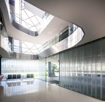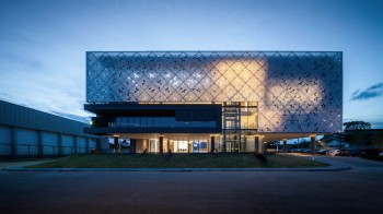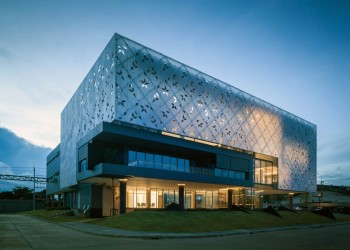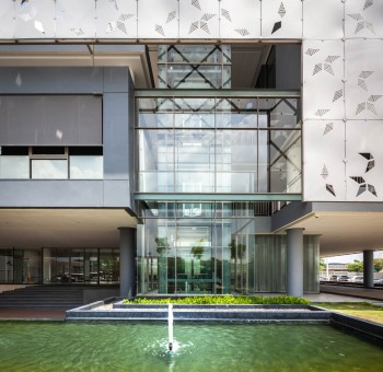 The building appearance is featured through the airiness and semi-transparency of the main facade. The component adds visual dimensions and effects to the building which gives changing moods over specific time of the day due to pattern and lighting. Also, the iconic facade functions as a second skin that screens out excess sunlight and rain from the naturally-ventilated multi-purpose and circulation space at the front.